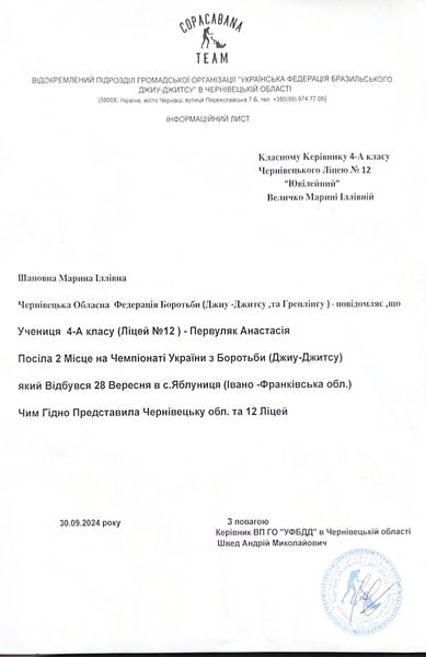 Вітаємо з перемогою учнів нашого ліцею, Первуляк Анастасію, ученицю 4-А класу і класного керівника Величко Марину Іллівну та Первуляк Олександра , учня 2-А класу і класного керівника Максим’юк Наталію Валеріївну. Юні спортсмени посіли 2-гі призові місця в Чемпіонаті України з Джиу-Джитсу у своїх вікових категоріях. Діти гідно представили Чернівецьку область і Чернівецький ліцей 12 « Ювілейний». Пишаємось здобутками наших учнів! Бажаємо успіхів та сил!