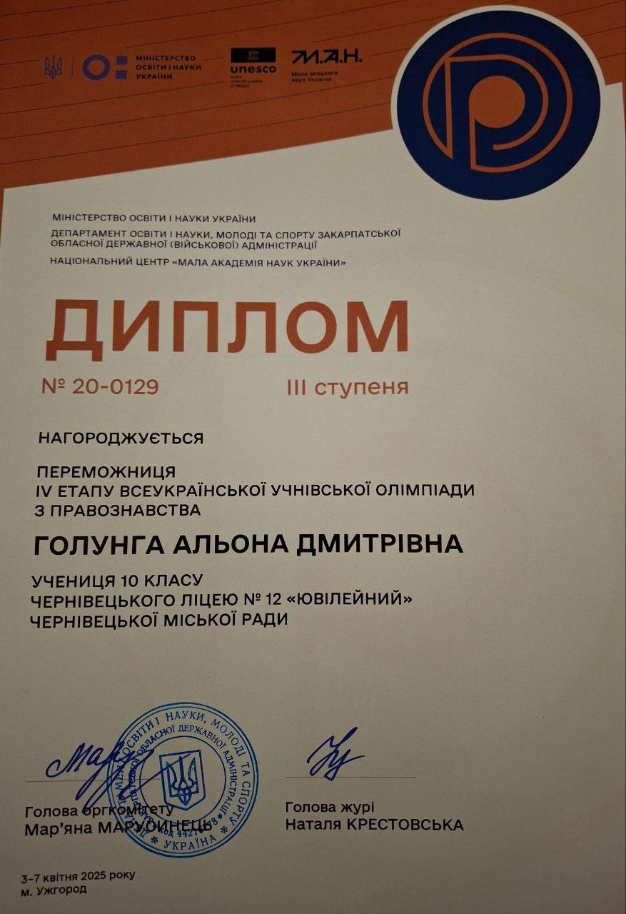 Щиро вітаємо Голунгу Альону🌸🌟, ученицю 10-А класу Чернівецького ліцею № 12 «Ювілейний», яка стала переможницею IV етапу Всеукраїнської учнівської олімпіади з правознавства та отримала диплом III ступеня👍