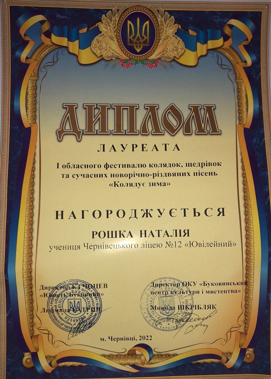 Учні нашого ліцею не залишилися осторонь цієї події. Творчі доробки представили Рошка Наталія, учениці 6А класу та вокальний ансамбль учнів 3 – 5 класів “Струмочок” (керівник Олена Кушнір). Наталка виконала новорічно-різдвяну пісню, яку саме для цього фестивалю написала її мама Оксана Первова–Рошка. А юні ліцеїсти порадували присутніх запальними щедрівками. Рошка Наталія та ансамбль “Струмочок” стали лауреатами І обласного фестивалю колядок, щедрівок та сучасних новорічно-різдвяних пісень “Колядує зима” . Вітаємо талановитих учнів та їхніх керівників!!!